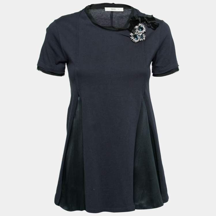 Pre Owned Prada Navy Blue Cotton & Silk Inset Applique Embellished T-Shirt S