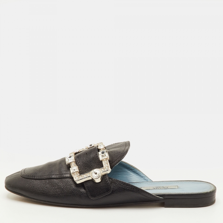 Pre Owned Prada Size 40 Black Leather Crystal Embellished Buckle Detail Flat Mules