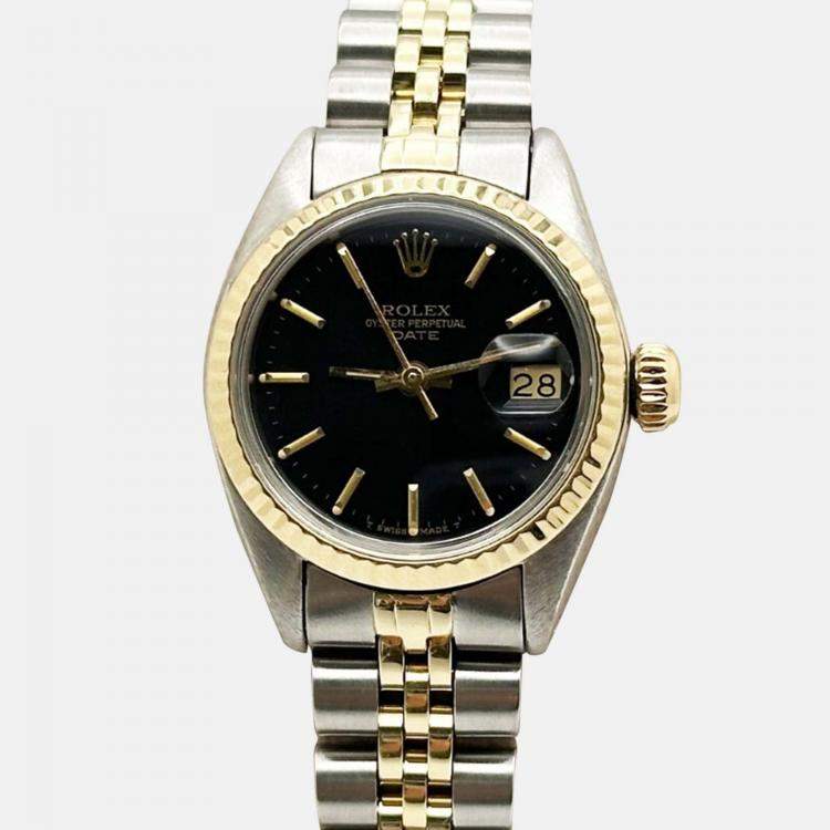 Pre Owned Rolex Date 6917 Automatic Black 14k Yellow Gold Stainless Steel Women's Wristwatch 26 mm
