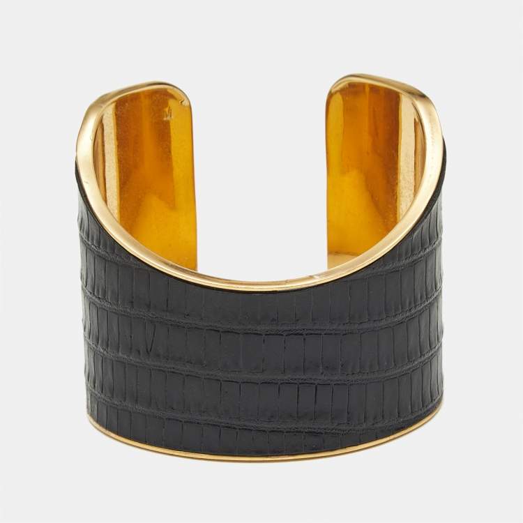 Pre Owned Saint Laurent  Black Leather Gold Tone Bracelet