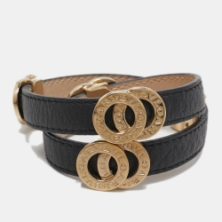 Bvlgari Black Leather Double-Coiled Gold Tone Wrap Bracelet