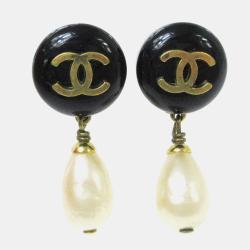Chanel Artificial Pearl Dangle Earrings Clip-On Black