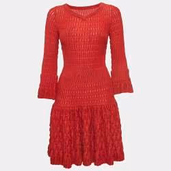 Alaia Red Chenille Wool Patterned Long Sleeve Skater Dress M