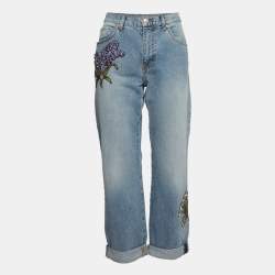 Alexander McQueen Blue Embroidered Floral Denim Boyfriend Jeans S Waist 28"