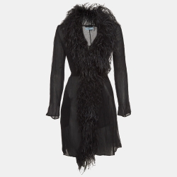 Prada Black Ostrich Feather and Silk Crinkle Semi Sheer Mid Length Coat XS