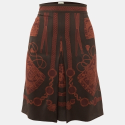 Hermes Dark Brown Printed Silk Pleat Detail Mini Skirt M