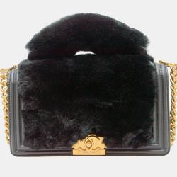 Chanel Black Leather Fur Medium Boy Top Handle Flap Shoulder Bag