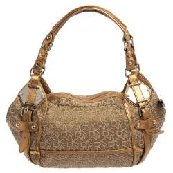 DKNY Gold/Beige Signature Fabric and Leather Satchel