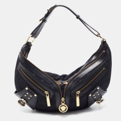 Versace Black Monogram Fabric and Leather Biker Hobo