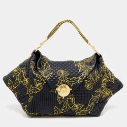 Versace Black/Yellow Barocco Leather Floral Stitch Hobo