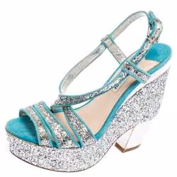 Miu Miu Turquoise Suede and Glitter Ankle Strap Platform Sandals Size 36