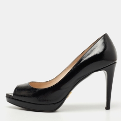 Prada Black Vernice Saffiano Leather Peep Toe Platform Pumps Size 35.5