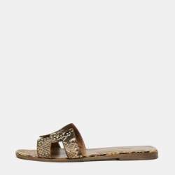 Hermes Gold/Black Suede Oran Dabka Flat Slides Size 38