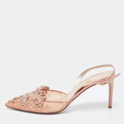 René Caovilla Pink Lace and Leather Crystal Embellished Slingback Pumps Size 39.5