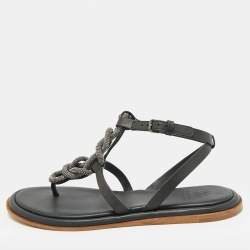 Brunello Cucinelli Metallic Grey Bead And Leather Strappy Sandals Size 36