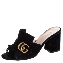 Gucci Black Suede Leather GG Marmont Fringe Mules Size 37.5