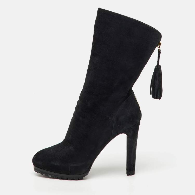 Pre Owned Yves Saint Laurent Black Nubuck Leather Tassel Mid Calf Platform Boots Size 37.5