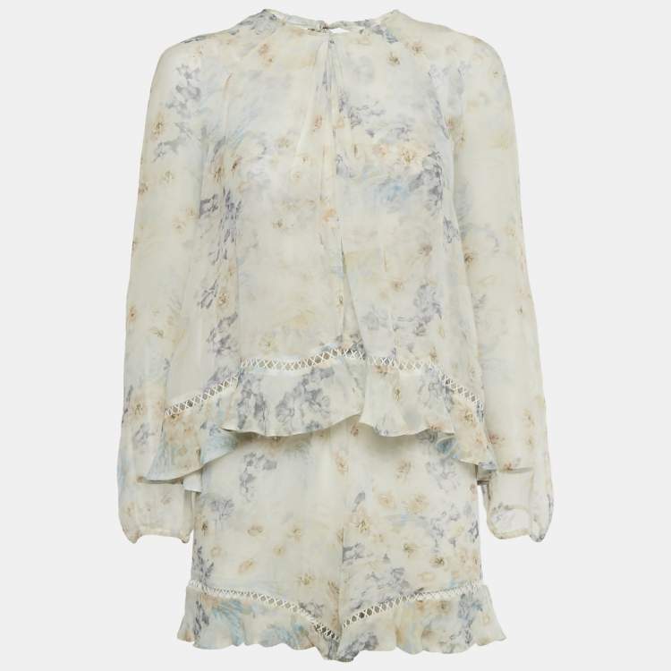 Pre Owned Zimmermann Cream Floral Print Silk Ruffled Playsuit S